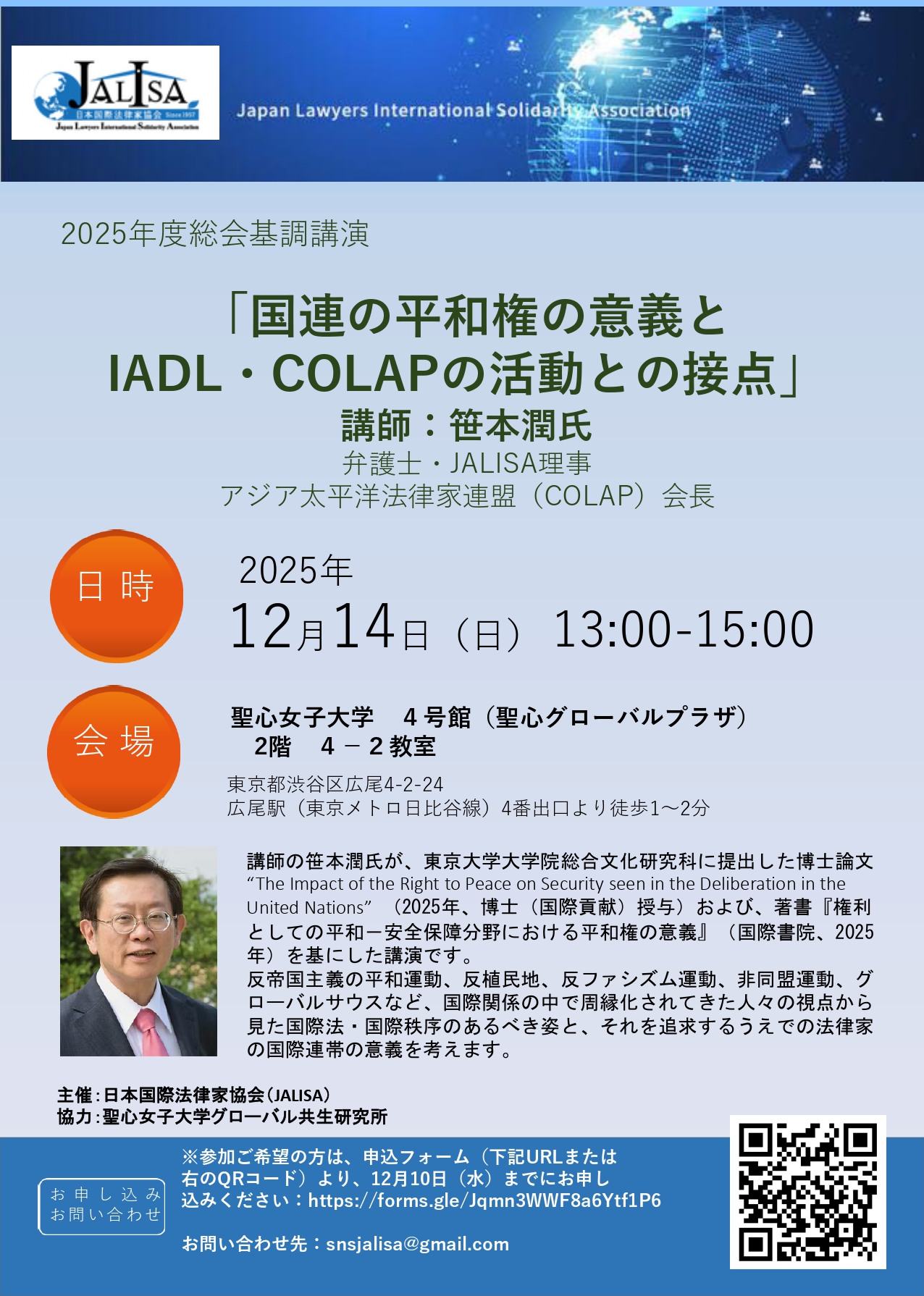 日本国際法律家協会が2025年度総会と講演会を開催します。会員以外の方でもご参加いただけます。