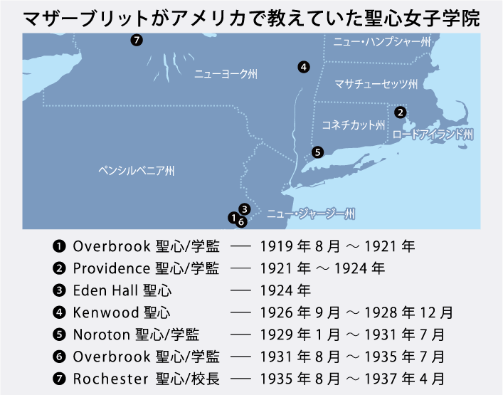 アメリカには1818年に、フランスからフィリピン・ドゥシェーン以下5人の聖心会員が派遣され、1818年にミズーリ州セントチャールズで聖心学院が開校。