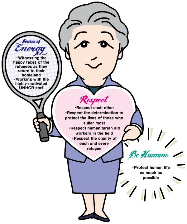 Mrs. Ogata's principle with regard to refugee support was to protect the dignity of human lives: "Refugee assistance does not end when the refugees return to their home countries," and "Where there is life, there is still a chance."